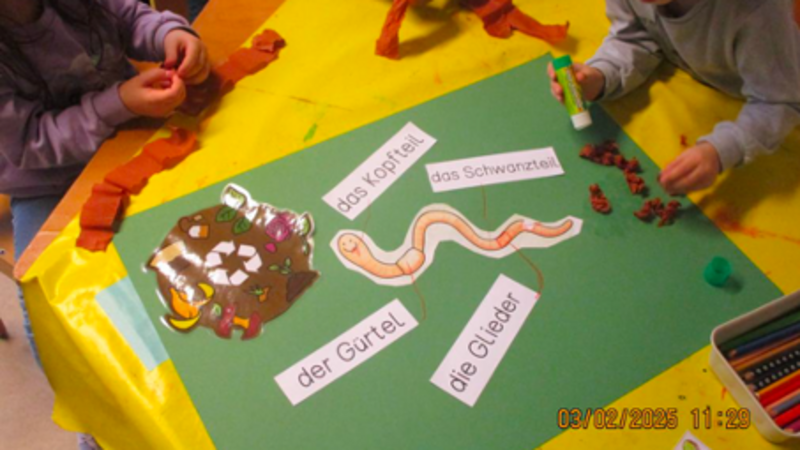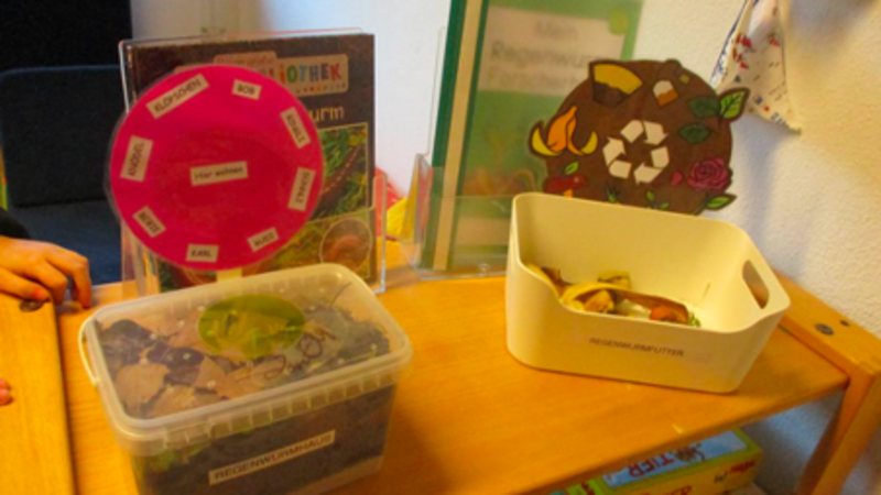 Auswahl der Bücher, Kinder haben das Beet komplett allein bepflanzt, Pflanzen ausgewählt, Würmer (Wurmpaten) versorgt, Würmer beobachten (Wurmbeobachtungsstation), Müll getrennt/Mülltrennspiele, Regenwurm- und Biomüll-Projektmappe für die Vorschulkinder.
