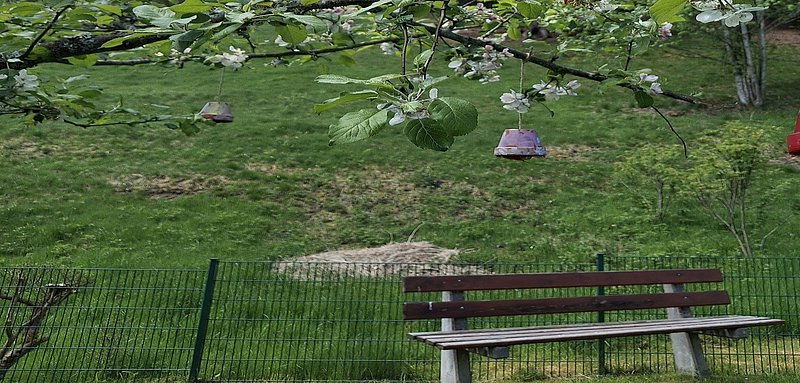 Die Mini-Insektenhotels hängen unter anderem an Bäumen im Garten.