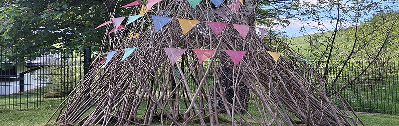Tag 3: Aufstellung des Tipis, mit Samen für Rankblumen bestücken. Vorhandenes Insektenhotel renovieren und Standortwechsel.