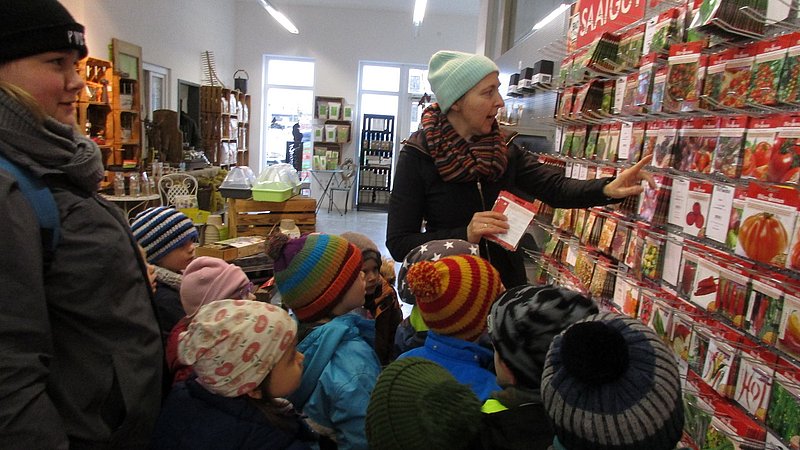Nach einer spannenden Busreise und dem längeren Fußmarsch durften die Kinder überlegen, was sinnvoll ist auszusäen bzw. was sie essen wollen.