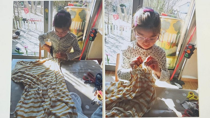 Dadurch das sie immer viele Tüten gefunden haben, sind wir im Haus auf die Suche gegangen, wo wir überall Tüten verwenden. Sie haben festgestellt, dass es eindeutig zu viele sind!! Gemeinsam mit uns Erziehern haben wir überlegt, wie wir selber Tüten herstellen können aber dabei keine neuen Ressourcen verbrauchen. Die Idee ist entstanden aus alten T-Shirts welche zu erstellen und das alles ohne nähen zu müssen. Mit den Kindern wurde ein Aushang für T-Shirt Spenden geschrieben und los ging es. Zum Abschluss war es den Kindern wichtig die Mülltrennung genauer unter die Lupe zu nehmen.