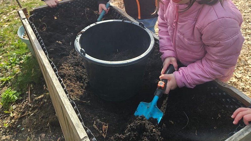 Es kamen nur noch zusätzlich zu dem Projekt der Kinder einige andere kleinere Projekte hinzu, wie zum Beispiel das Wasser sammeln zum Blumen gießen. Hierfür haben wir dann eine Regentonne aufgestellt.