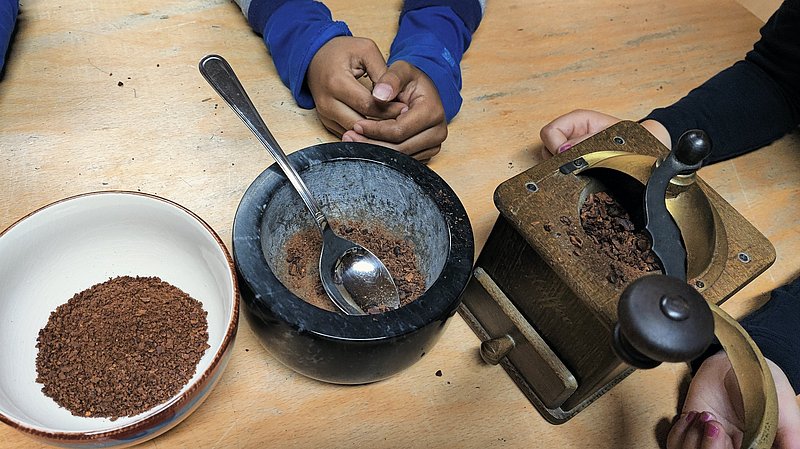 Schokolade wurde, ausgehend von der Kakaobohne, hergestellt: schälen, mörsern, mahlen.