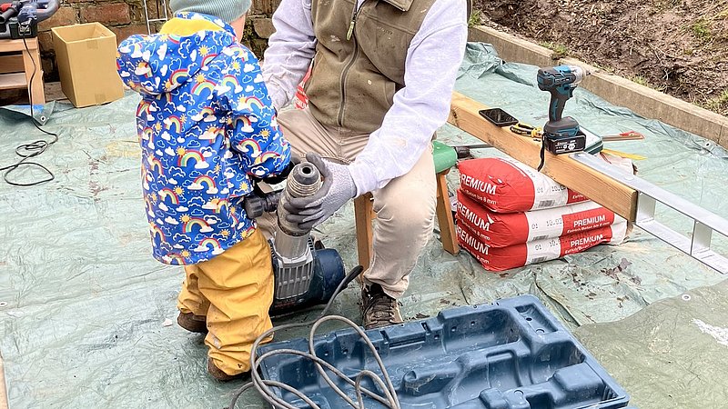 Die Kinder durften das Werkzeug beim Bau der Pergola betrachten und mit einem Erzieher gemeinsam ausprobieren.