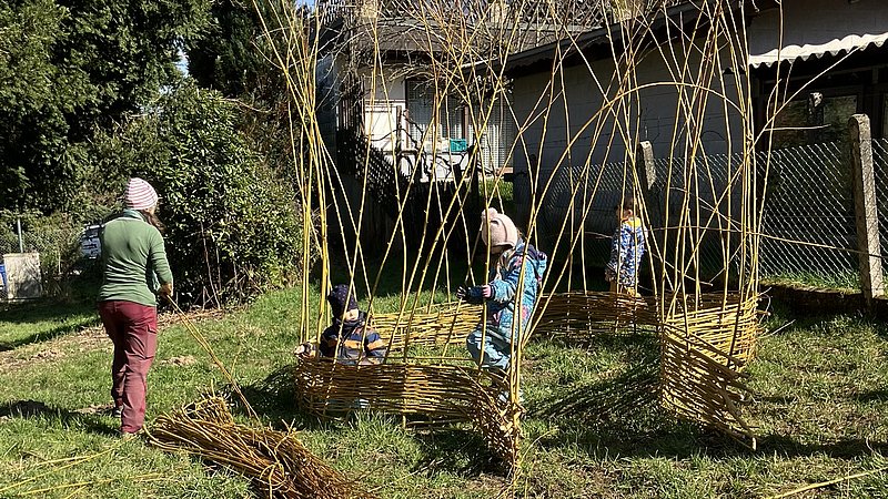 Die Mitarbeit beim Bau des Weidentippis war phänomenal. Vom Stecken bis zum Weben, sie wollten immer helfen und hatten dabei auch kreative Ideen, die wir umgesetzt haben. Mittlerweile ist es fertig. Zu unserer Freude sind die Weiden angewachsen. Die Kinder lieben darin zu vespern und zu spielen. Es ist der Lieblingsplatz der Kinder geworden.