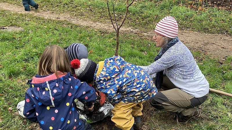 Zum Beispiel beim Pflanzen des Apfelbaumes wurde überlegt, wo der richtige Standort sein könnte, ein tiefes Loch gebuddelt, der Baum mit guter Erde versorgt – einige Kinder suchten Regenwurmerde und Kompost im Wald. Der Baum muss immer wieder gegossen werden. Wir beobachteten wie er geblüht hat und mittlerweile konnten wir schon die ersten Früchte entdecken.