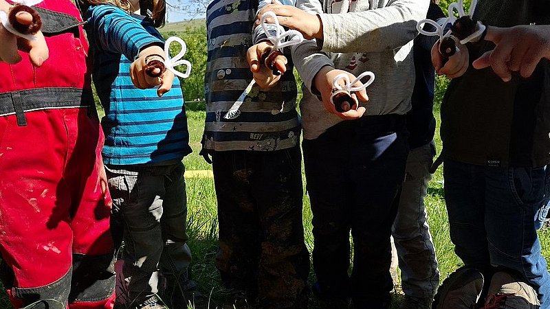 Die Kinder sind leicht für den Naturschutz zu begeistern und haben Lust mehr über die Tiere und ihren Lebensraum zu erfahren. Die Kinder konnten spielerisch viel von dem Thema mitnehmen durch handwerkliche Aktionen, Nachspielen von Naturprozessen oder der Kooperation mit Netzwerkpartnern. Stolz waren sie, als aus Kernen Setzlinge herangewachsen sind, wir aus dem Apfelbaumschnitt geschnitzt und die Rinde zum Färben genutzt haben. Spannend war, dass Rehe und Spuren vom Wildschwein gefunden wurden.