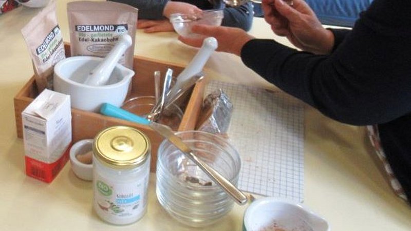 Den Begriff der Gerechtigkeit bei der Verteilung unterschiedlich großer Stücke Schokolade erfahren, eine Kakaobohne sehen/fühlen/riechen und zu Schokocreme verarbeiten, Schokodomino (der Weg von der Kakaobohne zur Schokolade), Wildbienenhaus und die Insekten auf der Blumenwiese beobachten.