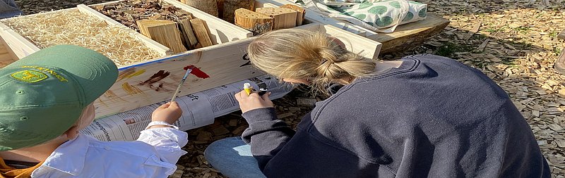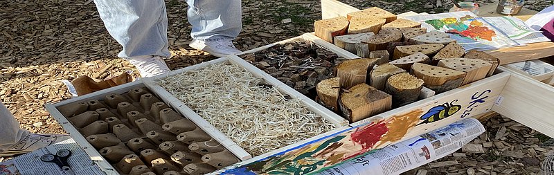 Die Kinder füllen das Insektenhotel mit Holzwolle.