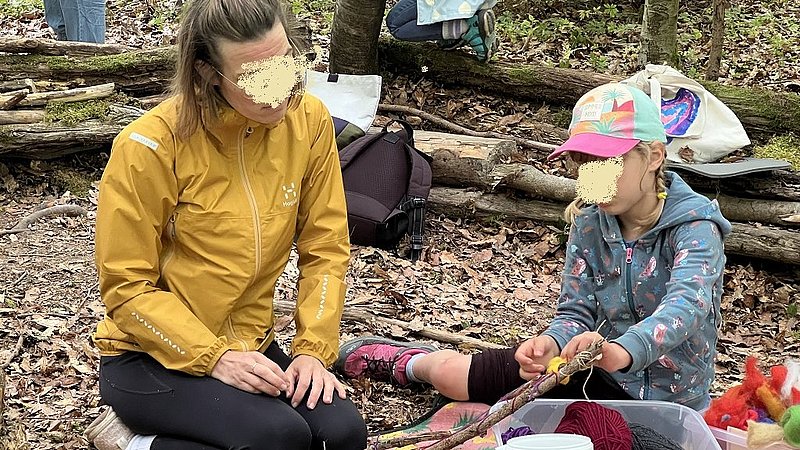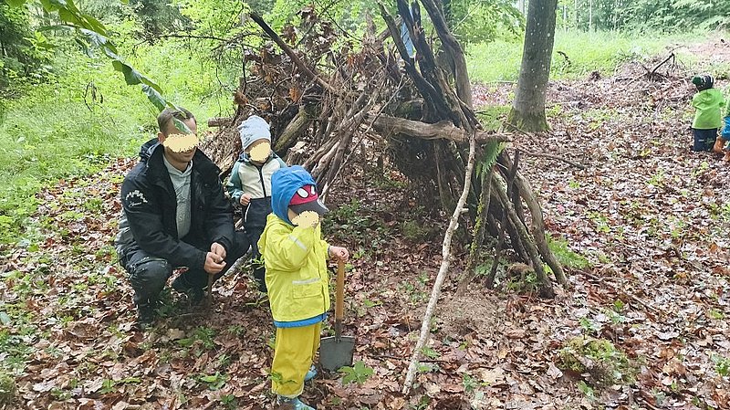 Nach unseren regelmäßigen Waldtagen befragen wir die Kinder, was ihnen besonders im Wald gefallen hat. Nach den Themen und Interessen der Kinder haben wir die Angebote der Projektwoche geplant: Waldsofa weiterbauen, gemeinsam im Morgenkreis überlegen, was wir für die Tiere des Waldes tun können, zum Beispiel Vogelnester bauen, die Tiere nicht erschrecken, keinen Müll liegen lassen und so weiter.