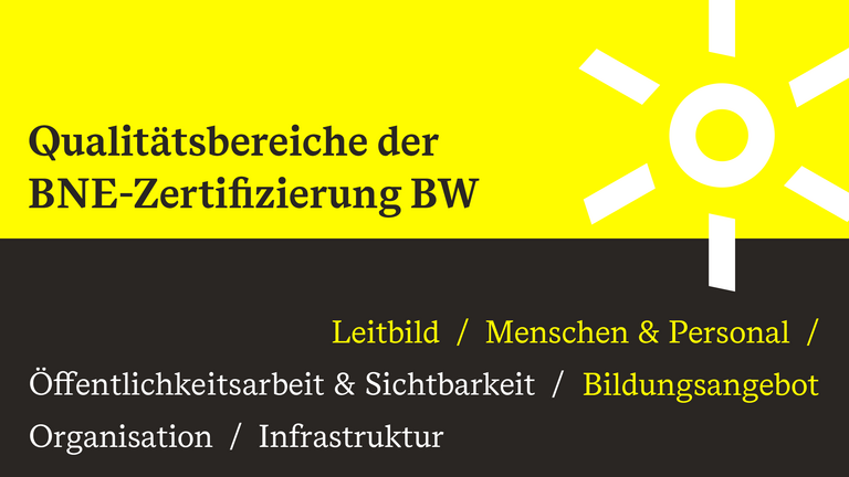 Die Zertifizierung der non-formalen BNE-Bildung in Baden-Württemberg bezieht sich auf sechs Qualitätsbereiche: Leitbild, Menschen und Personal, Bildungsangebot, Öffentlichkeitsarbeit und Sichtbarkeit, Infrastruktur und Organisation. Die Qualitätsbereiche orientieren sich grundsätzlich an der Agenda 2030 und den daraus folgenden Bildungsplänen auf Bundes- und Länderebene. Jedem Qualitätsbereich liegen Qualitätskriterien zugrunde. Die sechs Qualitätsbereiche fließen mit unterschiedlicher Gewichtung in die Bewertung ein. Dabei sind die Bereiche Leitbild, Menschen und Personal und Bildungsangebot die wichtigsten.