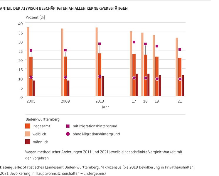 Seit 2017 sinkt der Anteil atypisch Beschäftigter in Baden-Württemberg leicht. Besonders unter den Frauen ist der Anteil atypisch Beschäftigter rückläufig und lag 2021 mit 31,8 Prozent ganze 5,7 Prozentpunkte unter dem Wert von 2005. Unter den Männern ist der Anteil verhältnismäßig stabil. Gleichwohl ist er immer noch fast dreimal niedriger (11,5 %). Mit 25,4 Prozent ist der Anteil atypisch Beschäftigter mit Migrationshintergrund überdurchschnittlich hoch, nimmt seit 2017 aber tendenziell ab. Damals hatte der Anteil noch bei fast 30 Prozent gelegen.