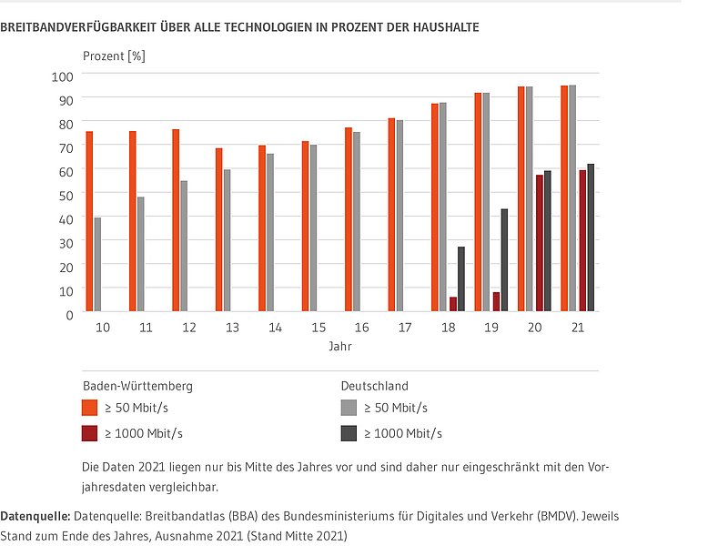 Die Breitbandverfügbarkeit in Baden-Württemberg hat sich in den vergangenen Jahren stark verbessert. Während im gesamten Land Ende 2017 nur 81,3 Prozent der Haushalte mit Bandbreiten von mindestens 50 Mbit/s versorgt waren, lag der Wert Mitte 2021 bereits bei 94,9 Prozent.
