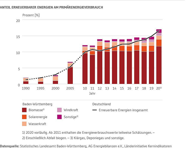 Die durch die Corona-Beschränkungen rückläufige Wirtschaftsleistung und die gesunkene Verkehrsleistung führten im Jahr 2020 zu einem deutlichen Rückgang des Primärenergieverbrauchs um 10,8 Prozent. Der Anteil erneuerbarer Energieträger am Primärenergieverbrauch lag im Jahr 2020 bei 17,0 Prozent und damit knapp 2,3 Prozentpunkte höher als im Vorjahr. Der mit 69 Prozent größte Anteil an den erneuerbaren Energieträgern entfällt auf die Biomasse, gefolgt von der Solarenergie (13 Prozent).