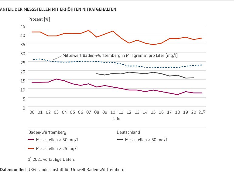 Dargestellt werden der Anteil der Messstellen mit einem Nitratgehalt über 50 Milligramm pro Liter (mg/l) sowie der Anteil der Messstellen mit einem Nitratgehalt über 25 mg/l. Die Messstellen mit Nitratgehalten über 50 mg/l sind eine Teilmenge der Messstellen mit Nitratwerten größer als 25 mg/l. Grundlage für die Berechnung sind 120 seit 1994 durchgehend beprobte Messstellen in ganz Baden-Württemberg. Die Daten dieses Messnetzes werden auch für die jährliche Berichterstattung an die Europäische Umweltagentur (EUA) herangezogen. Im Jahr 2021 konnten nur 119 Messstellen beprobt werden.