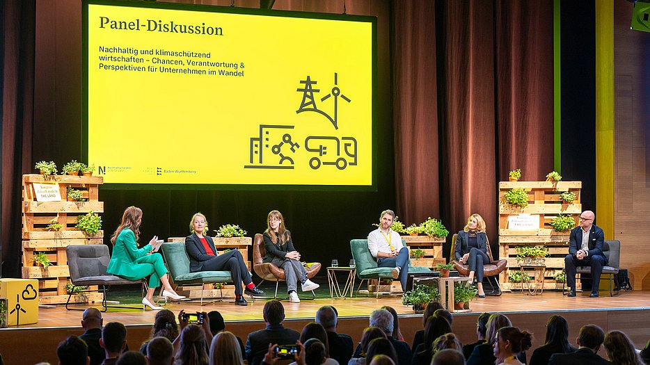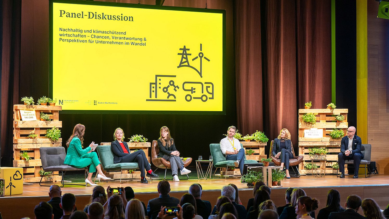 In der anschließenden Panel-Diskussion wurden mit Thekla Walker MdL, Dr. Insa Thiele-Eich, Andreas Huber (Geschäftsführer der Deutschen Gesellschaft Club of Rome), Christine Wüst (CHRO der Witzenmann GmbH) und Philipp Prechtl (Geschäftsführer der Koehler Innovative Solutions GmbH und Koehler Invest GmbH) die Chancen und Herausforderungen des unternehmerischen Klimaschutzes diskutiert.