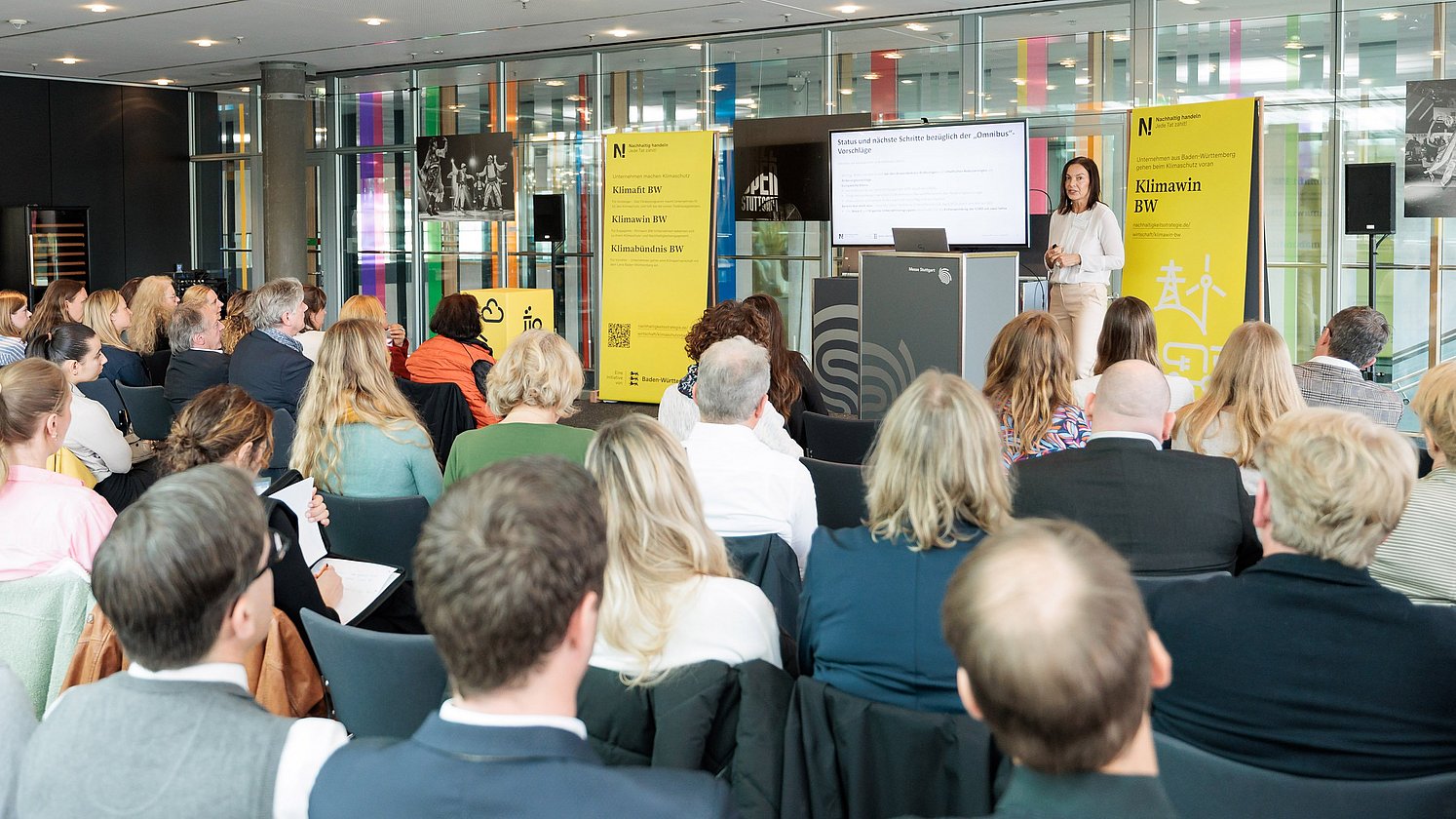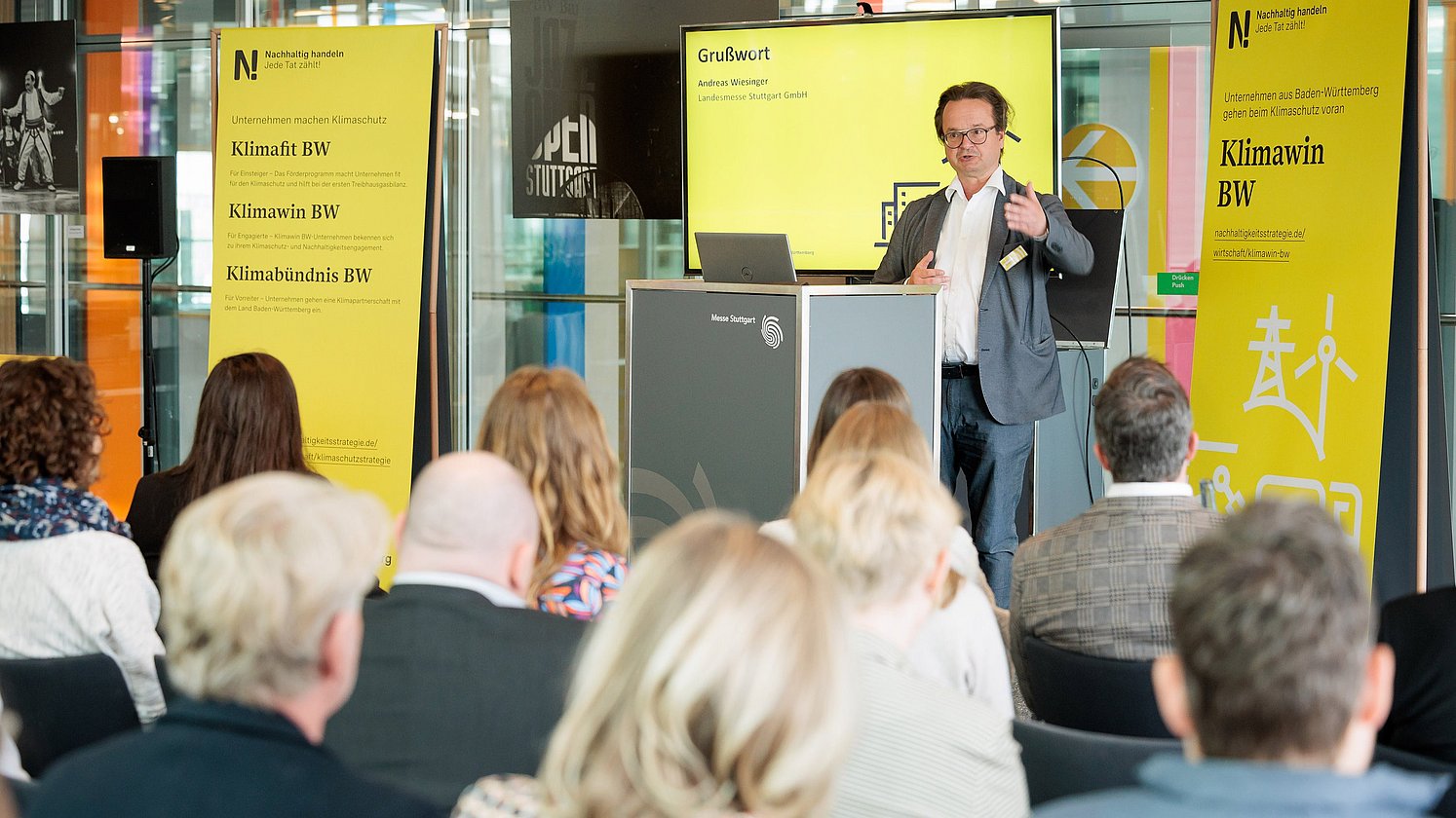 Im Rahmen der Frühjahrsmessen Stuttgart versammelten sich am 24. April 2025 erneut über 60 Vertreterinnen und Vertreter baden-württembergischer Unternehmen unterschiedlicher Branchen und Größe in der VIP-Lounge der Messe Stuttgart, um mehr über den Prozess und Mehrwert der Klimawin BW zu erfahren.