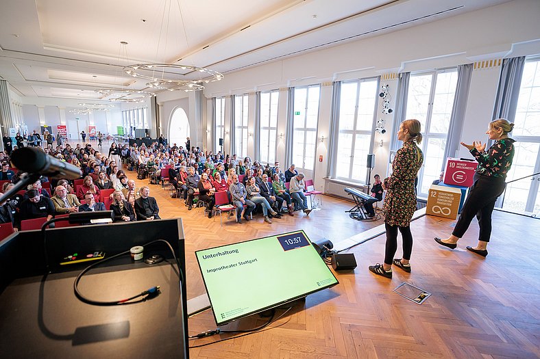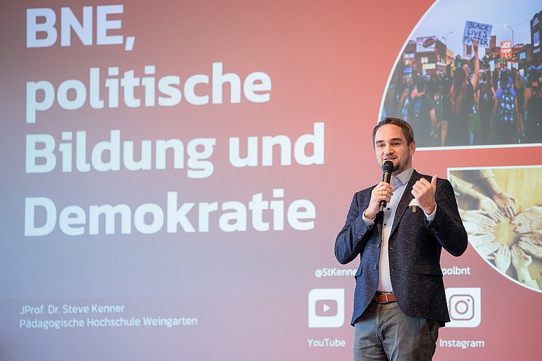 Umweltministerin Thekla Walker MdL und Kultusstaatssekretär Volker Schebesta MdL eröffneten das Programm. Danach gab es eine BNE-Zertifikatsverleihung, eine Keynote von JProf. Dr. Steve Kenner (Pädagogische Hochschule Weingarten) über Demokratiebildung und einen Beitrag des Improtheaters Stuttgart zum Mitmachen.