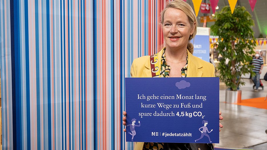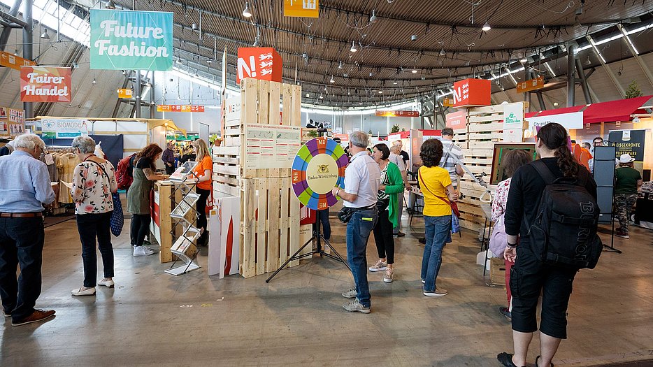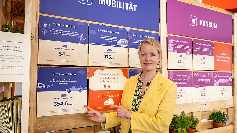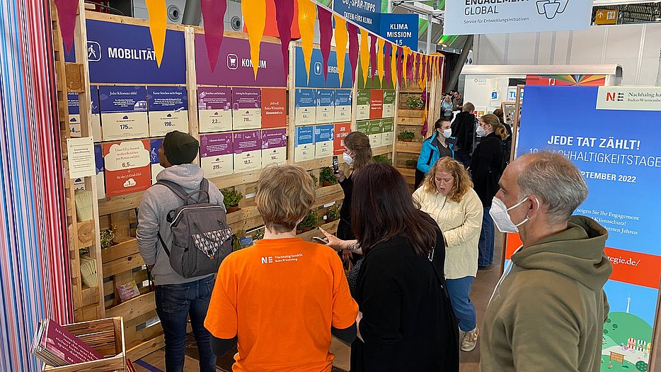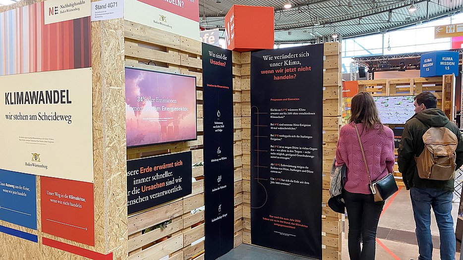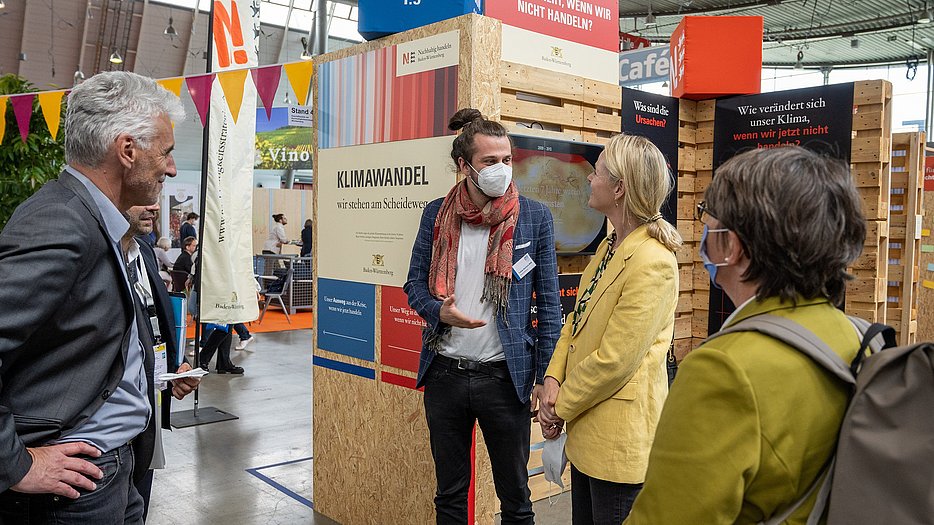Unter dem Motto „KLIMAMISSION 1.5“ zeigte die Nachhaltigkeitsstrategie vom 21. bis 24. April 2022 mit einem 48 m2 großen Messestand Probleme und Lösungen im Zusammenhang mit dem Klimawandel auf. Unter anderem konnten sich Interessierte eine einmonatige Klimachallenge setzen. Umweltministerin Thekla Walker MdL nahm sich bei Ihrem Besuch des Messestandes gleich mehrere Challenges vor, mit denen sie rund 365 Kilogramm CO2 im Monat einsparen kann.