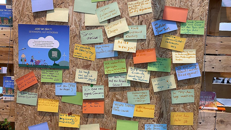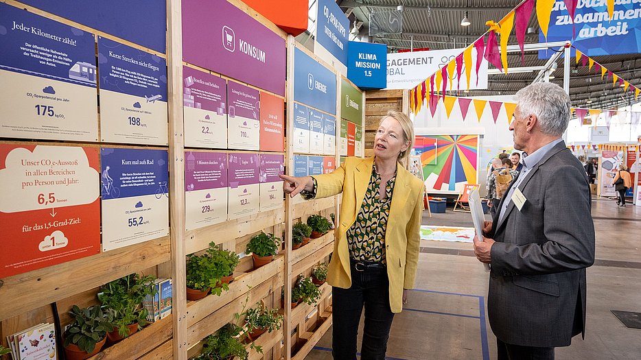 Mit plakativen Botschaften, emotional ansprechenden Filmen und konkreten Lösungsansätzen konnten sich Messebesucherinnen und -besucher über die Probleme und Handlungsoptionen rund um den Klimawandel informieren. Besonders großes Interesse weckten die CO2-Spar-Tipps. Dabei sorgte vor allem das Thema „Ernährung“ für viel Gesprächsstoff unter den Besucherinnen und Besuchern.