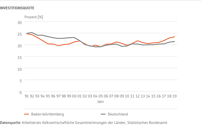 Seit 2015 hat Baden-Württemberg die Investitionsquote kontinuierlich gesteigert. 2019 lag sie bei einem Wert von 23,4 Prozent und damit so hoch wie seit 26 Jahren nicht mehr. Die Investitionsquote Deutschlands stieg in den vergangenen Jahren ebenfalls an, liegt seit 2004 jedoch niedriger als in Baden-Württemberg. In den 1990er-Jahren, als die Investitionstätigkeit in den ostdeutschen Bundesländern relativ hoch war, war dies noch umgekehrt. Dass die Investitionen in Baden-Württemberg im Wirtschafts- und Finanzkrisenjahr 2009 nicht stärker zurückgingen, ist den Konjunkturprogrammen zur Förderung der Binnenwirtschaft zu verdanken.