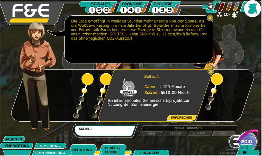 Außerdem kannst du in den kompletten Forschungsstrang „SOLTEC“ investieren. Hier wird voll auf solartechnische Großanlagen gesetzt, zum einen ein großes solarthermisches und internationales Kraftwerk in der Wüste außerhalb von Energetika, zum anderen in den Ausbau Fotovoltaischer Großkraftwerke. Beide Säulen werden in dem SOLTEC-Projekt zusammengefasst. SOLTEC kann in drei Stufen ausgebaut werden und liefert entsprechend jeweils mehr Strom zu gleichzeitig verbesserten Bruttopreisen. Wenn es Dir gelingt, die dritte Ausbaustufe von SOLTEC zu erforschen, stellt Solarenergie einen überaus großen Anteil am Strommix von Energetika: Die Zukunft kann sonnig werden.