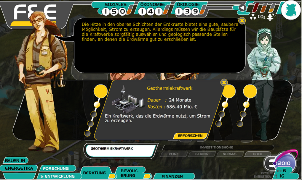 Wenn du in den Forschungsstrang "erneuerbare Energien" investierst, dann erforschst du als erstes die Möglichkeit, Geothermiekraftwerke zu bauen. Ihr Stromertrag ist, anders als in Wirklichkeit, in allen möglichen Geothermie-Gebieten in Energetika gleich, er liegt bei nur etwa 100 MW. Damit zählen Geothermiekraftwerke zu den kleinsten in Energetika. Die Gebiete, in denen du ein Geothermiekraftwerk bauen kannst, zeigt dir die Minimap rechts oben, gehe dafür auf die Anzeige "Geothermie".