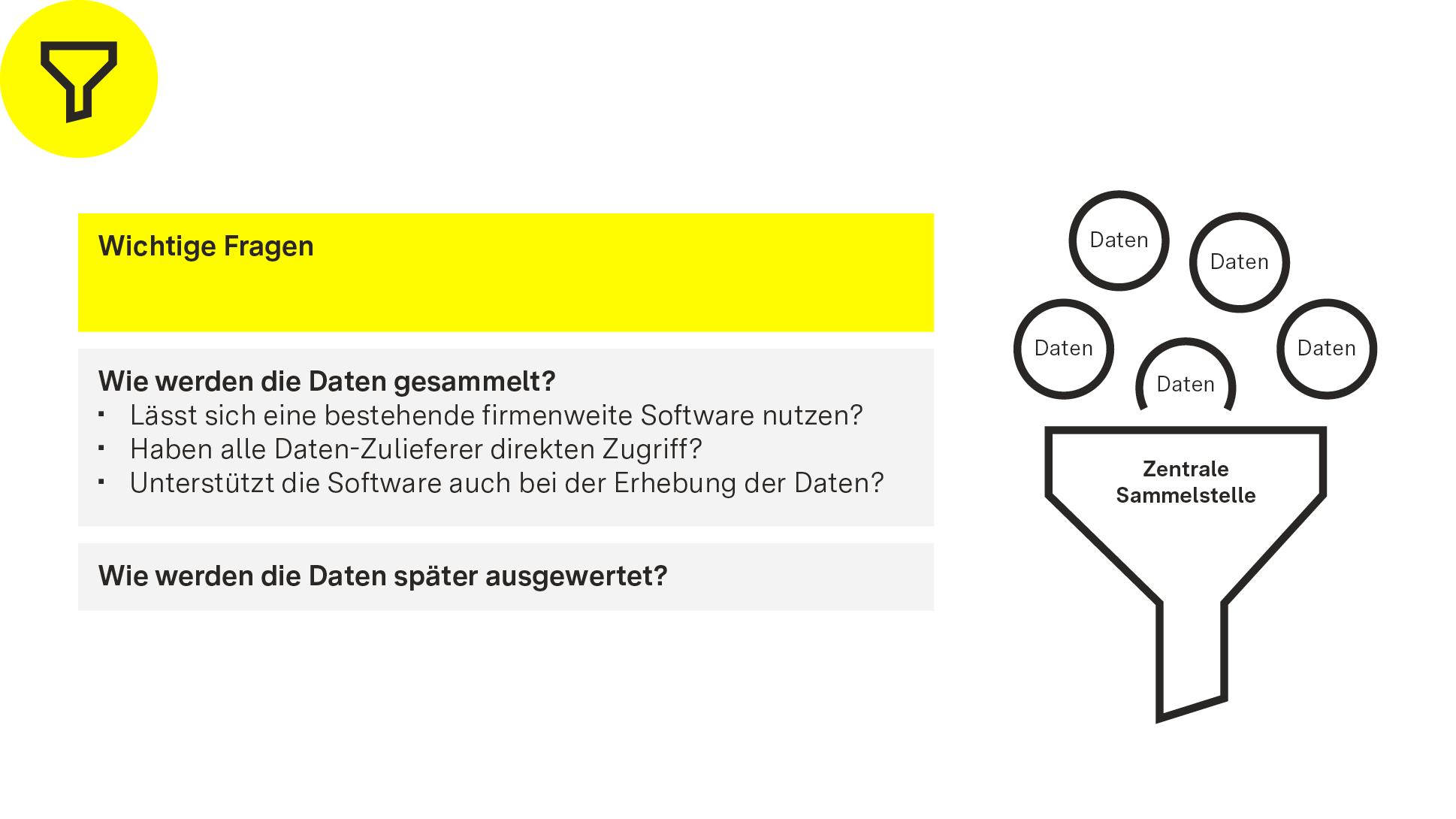 Für das Sammeln der Daten braucht es eine zentrale Stelle. Das kann eine firmenweit genutzte Software oder eine Excel-Tabelle sein. Wichtig ist, dass alle Daten an einem Ort zusammengeführt werden können. Wenn alle angefragten Kolleginnen und Kollegen selbst Zugriff auf den zentralen Ort haben und ihre Daten direkt dort ablegen können, wird der Prozess noch effizienter. Beim Anlegen der Sammelstelle lohnt es sich gegebenenfalls, die Datenerhebung sowie die spätere Auswertung bereits mitzudenken. Es kann von Vorteil sein, ein etabliertes System beizubehalten, um die Hemmschwelle für Kolleginnen und Kollegen niedrig zu halten. Gleichzeitig kann die Nutzung einer neuen, spezialisierten Software die spätere Auswertung vereinfachen.