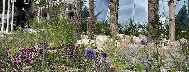 Im Fokus stand die naturnahe Umgestaltung bereits vorhandener Außenflächen an der Hauptverwaltung Stuttgart. Konventionelle, monotone und teilweise nicht‑heimische Bepflanzungen sowie strukturarme Grünbereiche wurden konsequent durch vielfältige Pflanzflächen mit heimischen, robusten und trockenheitstoleranten Stauden und Sträuchern ersetzt. Ergänzend sorgen Zwiebelpflanzungen für ein durchgängiges Blühangebot von Februar bis in den Herbst. Zur ökologischen Aufwertung und Pflegeoptimierung wurde eine mineralische Kiesmulchschicht eingesetzt, die den Boden schützt, den Pflegeaufwand reduziert und die Ausbreitung unerwünschter Arten begrenzt. Samenstände und Stängelstrukturen verbleiben über den Winter und bieten Nahrung für Vögel sowie Überwinterungsquartiere für Insekten. Ergänzt wird die Bepflanzung durch extensive Wiesen- und Saumansaaten, Strauchpflanzungen, Trockenmauern mit offenen Fugen sowie stehendes Totholz, die zusätzliche Lebensräume und Nistmöglichkeiten schaffen. Die Maßnahmen wurden schrittweise, standortgerecht und im Bestand umgesetzt und eng mit Facility‑ und Baumanagement sowie dem Nachhaltigkeitsmanagement abgestimmt. Durch die Kombination aus fachlicher Beratung, professioneller Planung und praktischer Umsetzung entstand ein artenreicher, vernetzter Standort, der Biodiversität fördert, das Mikroklima verbessert und zugleich die Aufenthaltsqualität für Mitarbeitende erhöht. Das Projekt dient als übertragbares Referenzbeispiel für die Integration von Biodiversität in Unternehmensflächen.