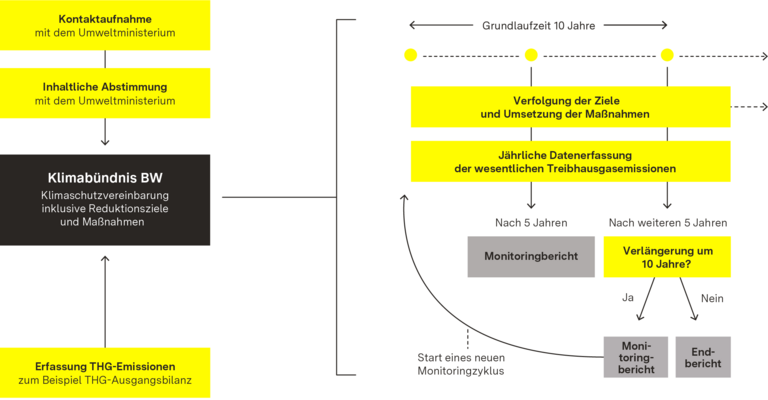 Nach fünf Jahren ist ein erster Monitoringbericht zu erstellen. Nach zehn Jahren können Sie Ihre Klimaschutzvereinbarung um weitere zehn Jahre verlängern. Sollten Sie sich dazu entscheiden, ist ein zweiter Monitoringbericht erforderlich. Falls Sie die Klimaschutzvereinbarung nicht verlängern wollen, ist von Ihnen ein Endbericht zu erstellen.