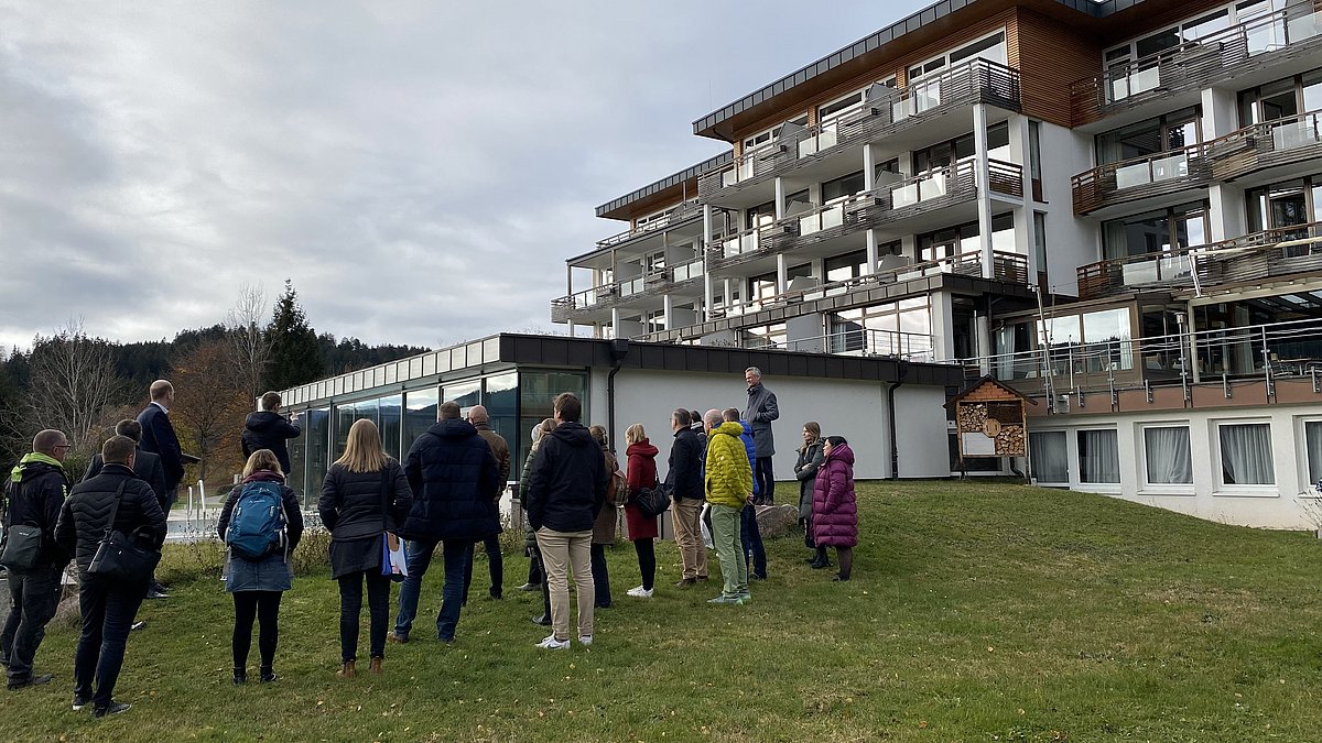 Die Veranstaltung startete im Seehotel Wiesler. Nachdem das Ministerium für Umwelt, Klima und Energiewirtschaft Baden-Württemberg die Teilnehmenden begrüßt hatte, erläuterte Fabian Wiesler vom Seehotel Wiesler den Klimaschutz- und Kreislaufwirtschaftsgedanken des Wellnesshotels am Titisee. Bei einem Betriebsrundgang zeigte er anschließend unter anderem die neue fossilfreie Energieversorgung des Klimabündnis-Unternehmens sowie den kreislauffähigen Neubau der Inara Suites.